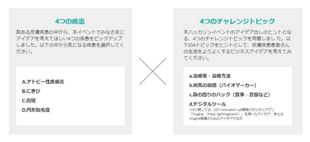 「Hacking Dermatology」は、異業種・異分野からの参加を促し、皮膚科領域のイノベーションやアイデア創出を支援します。そのため参加者に医療や製薬業界における特別な知識や経験を求めません。ビジネスアイデアを生み出しやすいよう、4つの皮膚疾患(アトピー性皮膚炎、にきび、白斑、円形脱毛症)と4つのチャレンジトピック(治療薬・治療方法、病気の指標、身の回りのハック、デジタルツール)を設定します。参加者は、これらの疾患、チャレンジトピックをテーマに、チームごとに自由にハッキングし、具体的なビジネスモデルを議論していきます。